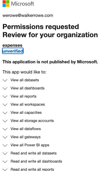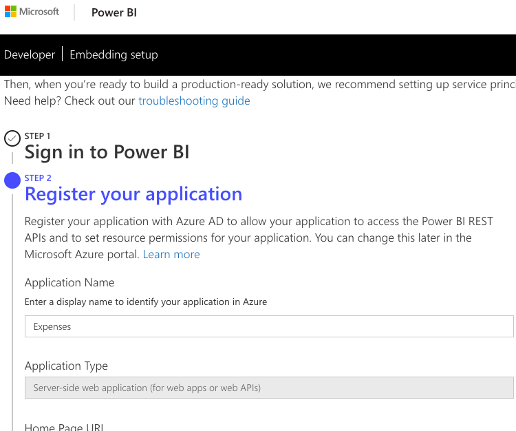 This is not the same as logging into Azure and creating an application in Active Directory there. You are creating an application on Power BI’s Azure account (if you want to think of it that way).