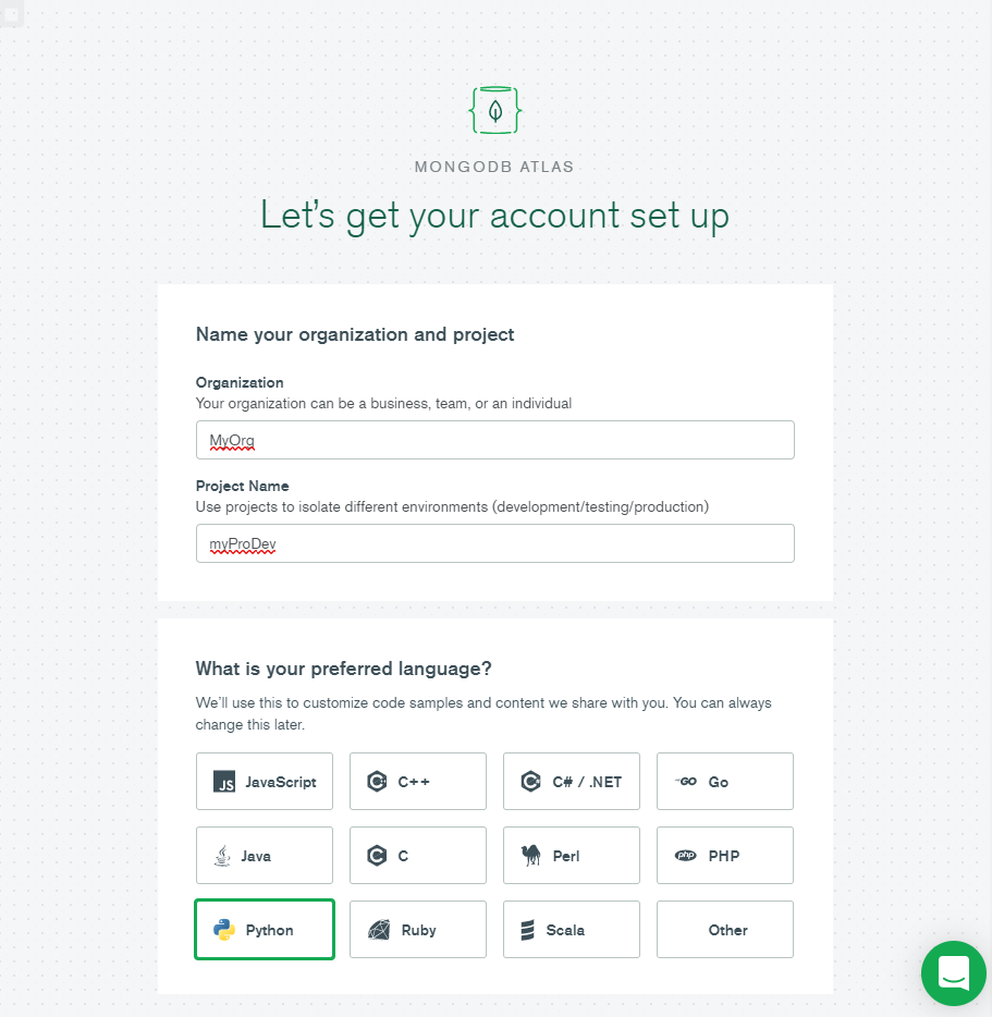 After creating the account, enter the organization name, project name, and select your preferred language. For this tutorial, we will select Python.