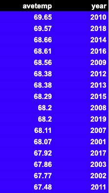 Here are the results. It shows the hottest months for the 20 years of data. I have cut off the display to make it short. For example, in the 20 years, August 2010 was the hottest month.