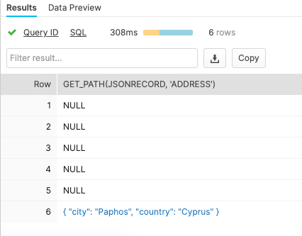 select get_path(jsonrecord, 'address') from JSONRECORD;