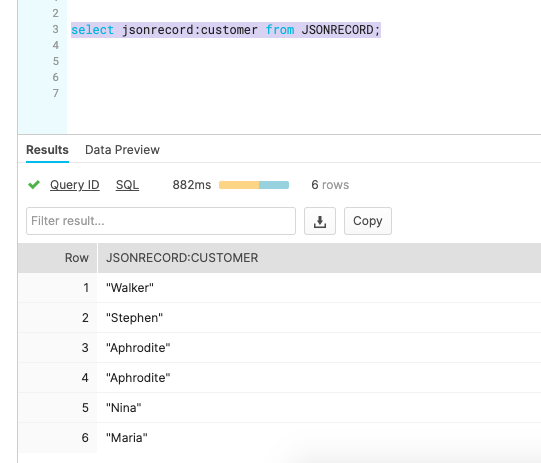 select jsonrecord['address']['city'] from JSONRECORD where jsonrecord:customer = 'Maria';