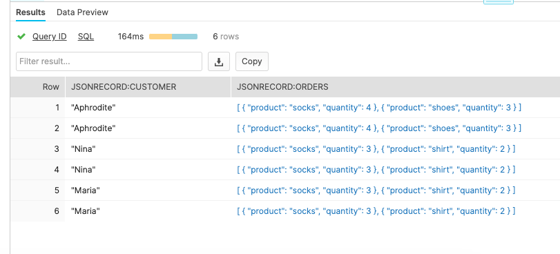 Here, we flatten the array. This record has two order JSON records. So, it shows two rows in the results, with each record attached to the other attributes.