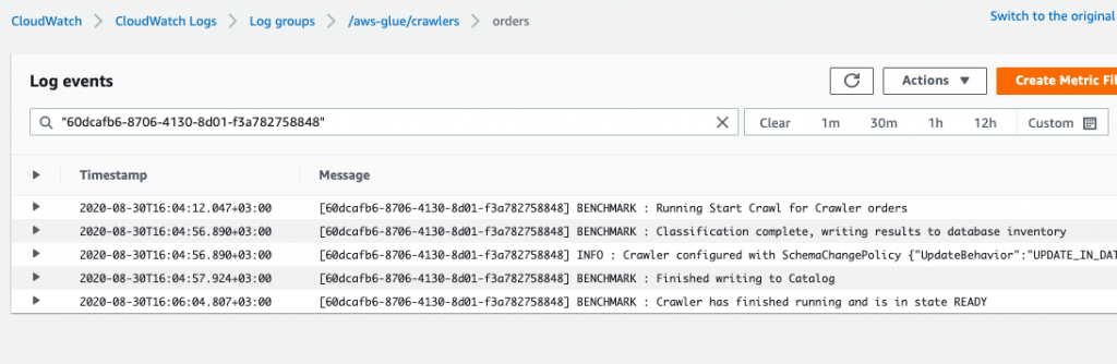 Then you run the crawler, it provides a link to the logs stored in CloudWatch. Look there for errors or success.